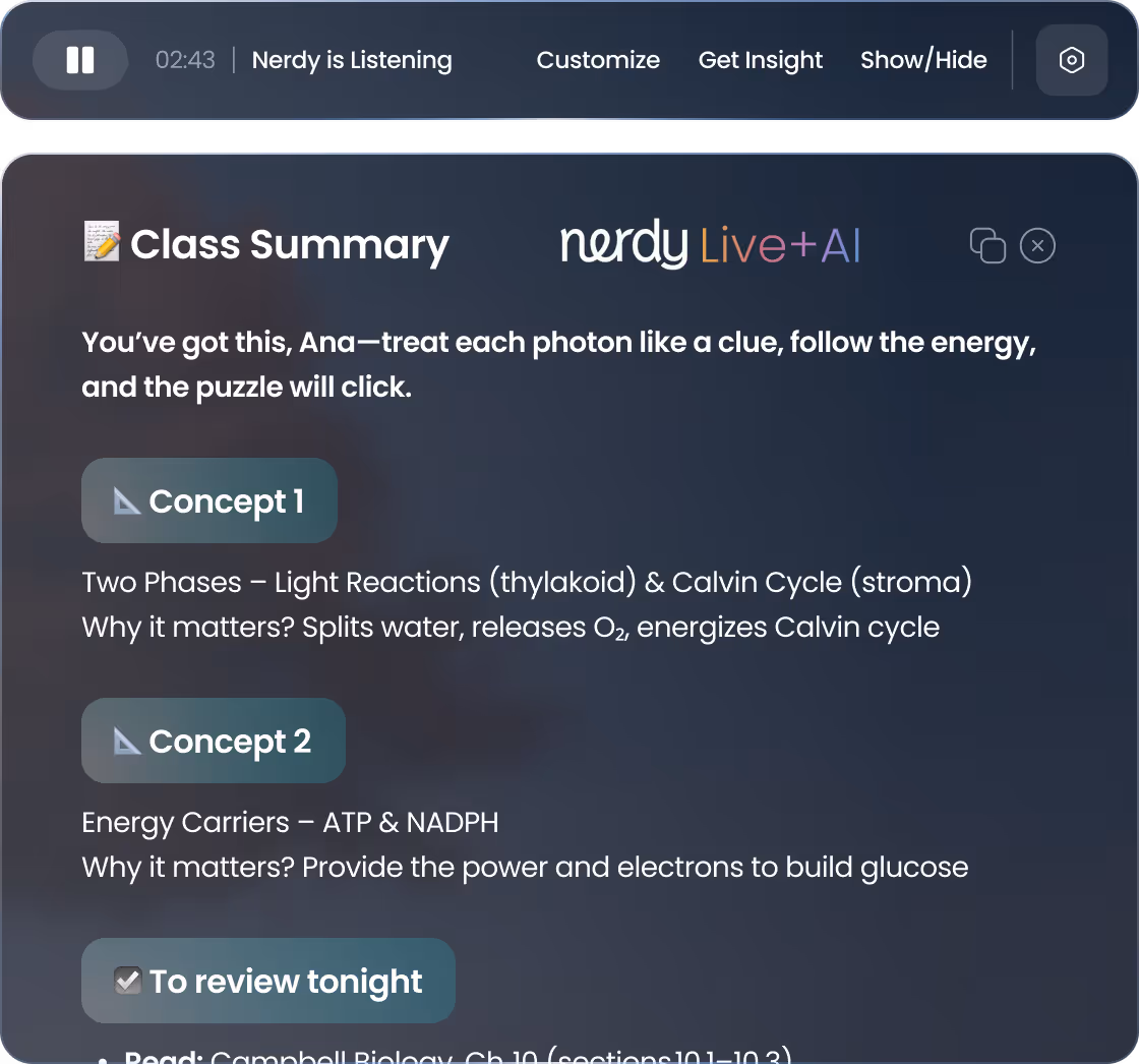 Nerdy has completely changed how I study. It’s always there when I get stuck, whether I need help summarizing a lecture or understanding tough science topics.